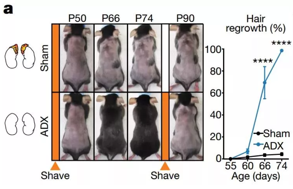 为了探究这其中的具体机制,该团队利用小鼠为实验模型,在小鼠出生后35天(小鼠毛发进入休止期之前)切除小鼠两侧肾上腺(ADX组),阻断压力激素的分泌。